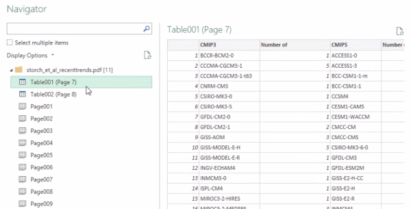 - The “Navigator” window will pop up. Excel will analyze the PDF and list every “Table” and “Page” it finds. Click through the list on the left to preview the data.